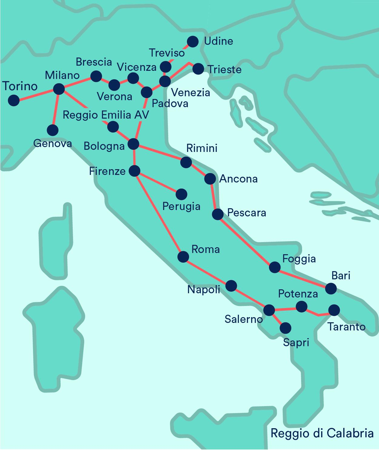이탈리아는 세로형 방향으로는 고속철도가 잘 발달되어 있어요. 우리랑 많이 비슷하죠. 서울에서 부산 혹은 반대로 부산에서 서울 방향의 고속철은 많으나 경주에서 전주를 갈려면 서울을 거쳐 가거나 아니면 버스로 시간이 참 많이 걸리죠.
